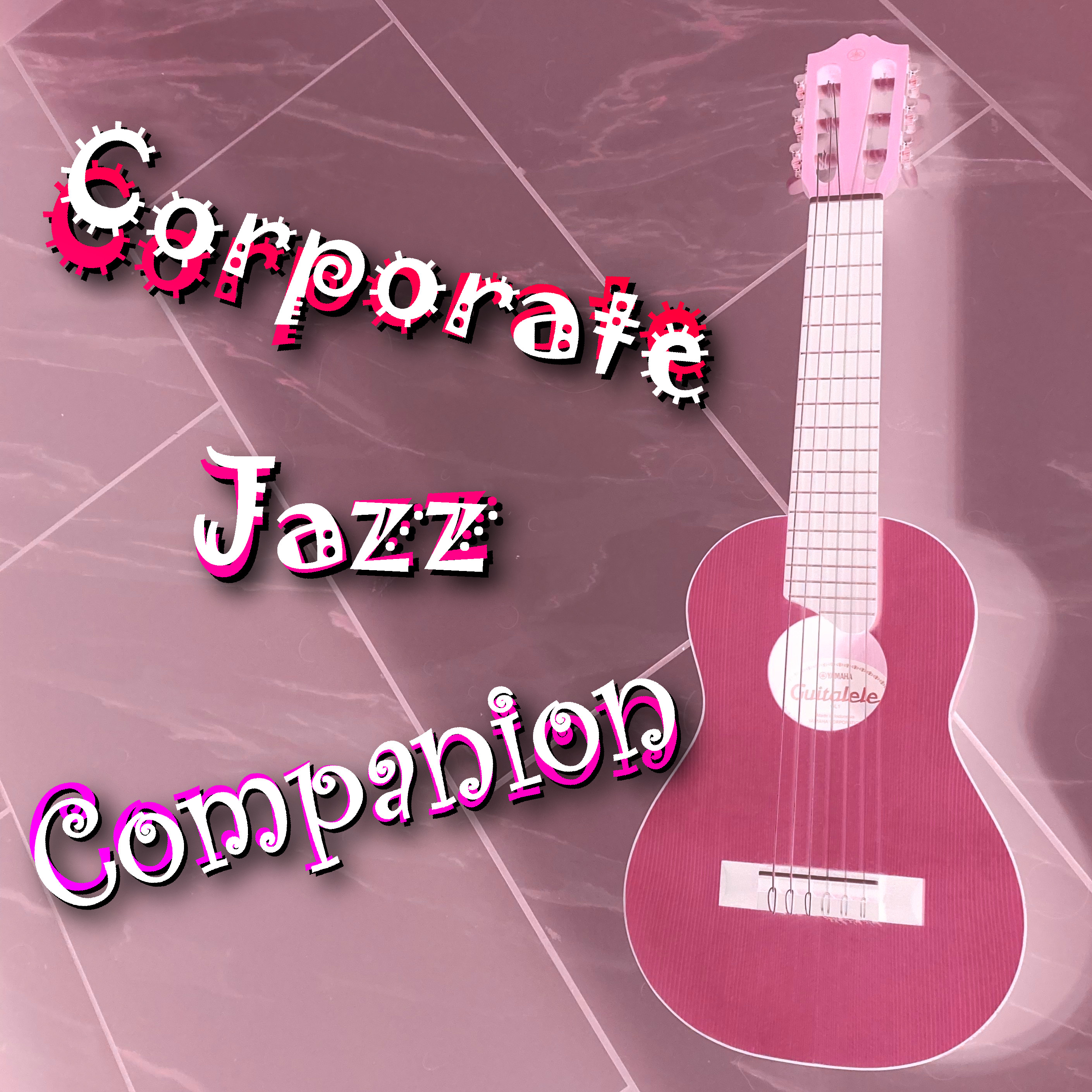 A color-inverted Yamaha guitalele in pink, beside this text in the Jokerman font: "Corporate Jazz Companion", with "Companion" written in Curlz MT