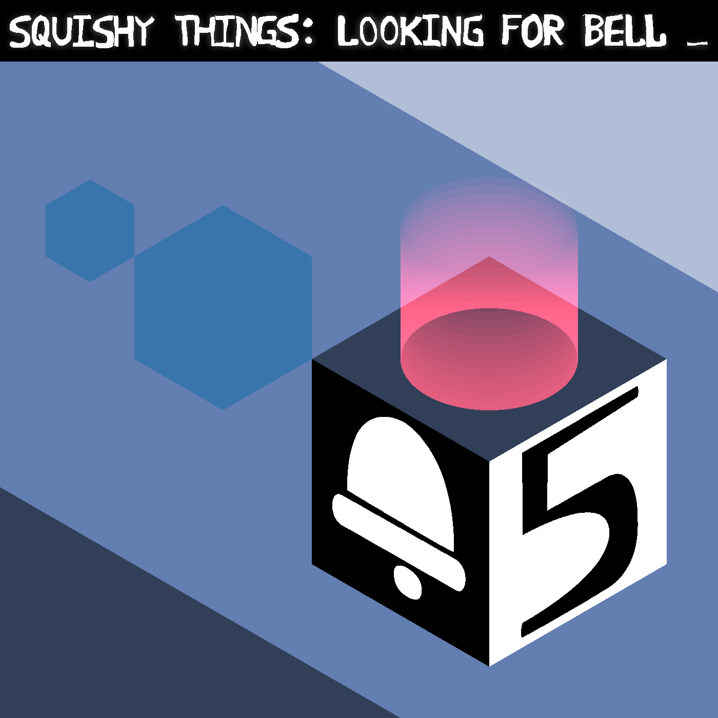 [A sky-blue landscape with dark gray and light gray edges. Two blue blocks are floating in midair. Next to them is a black-and-white block displaying a bell and the number 5; a purple light is coming out of it.]