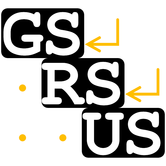 "GS", "RS", and "US" in black boxes extending down-right. The blank space to the left of the last two boxes is denoted by orange circles, and the first two boxes are followed by a "return" arrow.