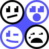 Four abstract faces tiled in a square: one indifferent, one surprised, one smug, and one despondant. The surprised and smug faces, and the space they share diagonally, are colored blue.