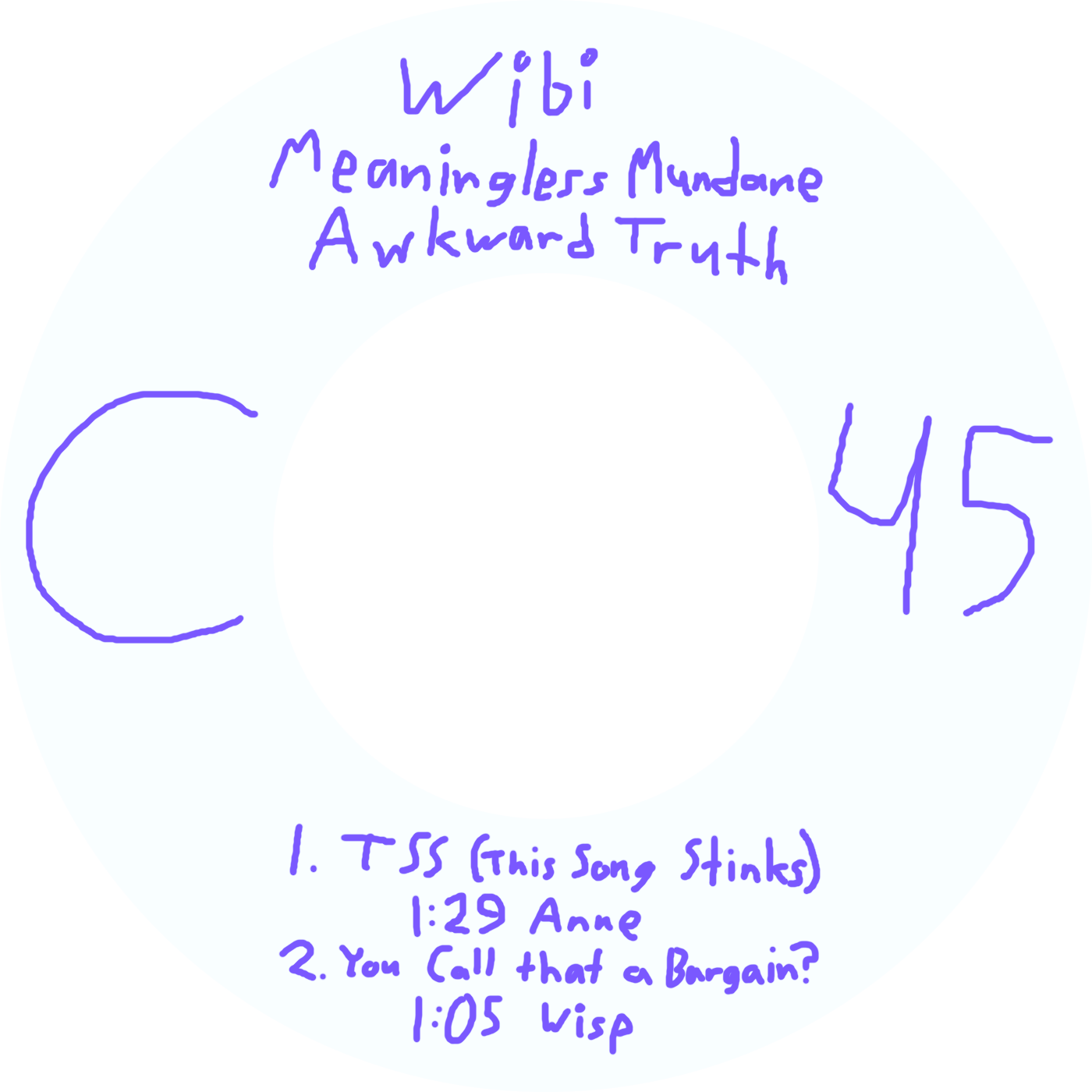 ![Record Store Day 2036 7" side C [a large-hole record label; everything is written in blue marker]